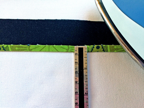 - Wrap the binding up and over to the interior. The folded edge of the binding should just cover the first seam. Pin in place.