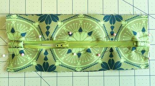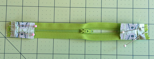 - Pin a folded pocket piece to each side of the zipper. The slightly wider of the two pocket pieces goes on the left, the narrower on the right. Take the time to make sure each folded edge is the same distance to either side of the zipper teeth. Pin in place.