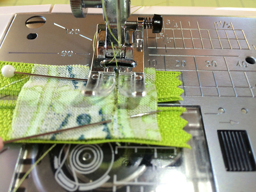 - Place one strip on each end of the zipper so the strip and the zipper are right sides together and the end of each strip is about ¼” from the raw end of the zipper tape. The zipper should be open about half way.