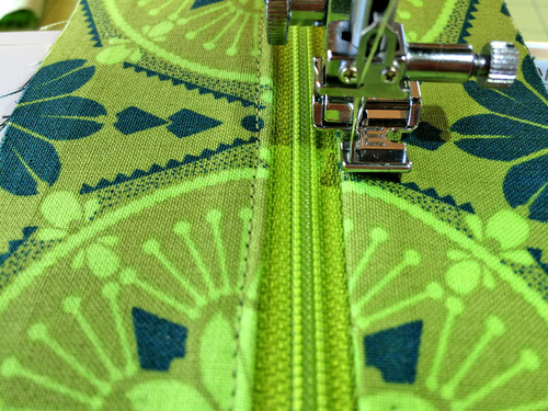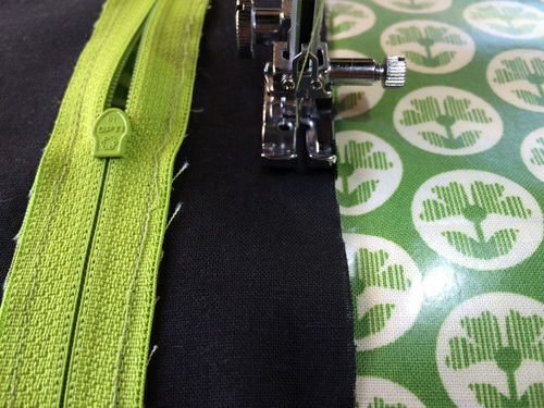 - Attach a Zipper foot and topstitch along each side of the zipper. Re-thread the machine if necessary with thread to match the fabric in the top and bobbin. Again, make sure your seam is consistent along both sides. As with all zipper installations, you’ll need to stop with your needle in the down position when you are approaching the zipper pull. Lift the presser foot to access the pull and zip closed. Drop the foot and continue your seam.