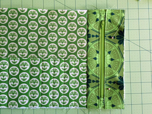 - Place the interior base panel right side up and flat on your work surface. Place the zippered panel right side down over the pocket, aligning the left raw edge of the zippered panel with the right raw edge of the pocket. Pin in place.