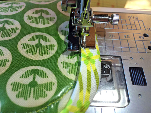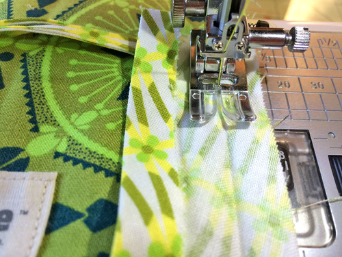 - Using a ¼” seam allowance, stitch along the entire vertical edge of the zippered panel. We used our Janome Quarter Inch Seam foot.