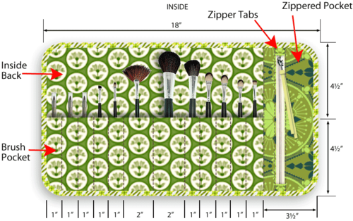 - This vertical seam secures the right edge of the brush pocket panel and creates the left interior edge of the zippered pocket.