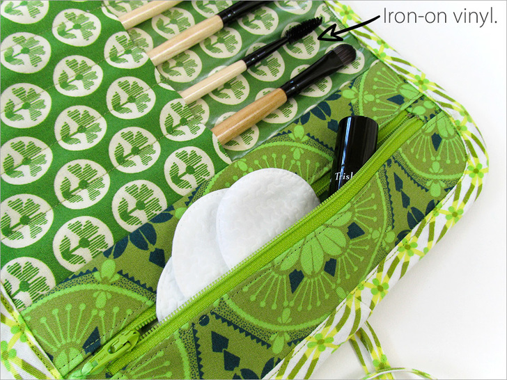 There’s a layer of iron-on vinyl protecting the entire base panel. You could also use a cotton laminate fabric, but iron-on vinyl is a nice option when you have a specific cotton fabric you want to use for the best color and pattern match. The vinyl provides a wipe clean surface for the brushes to rest against.