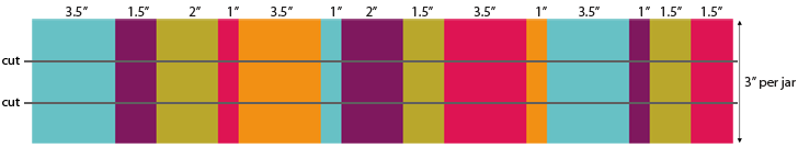 - The three finished strips are cut at 1″ wide, so you need at least 4″ in length per jar wrap. The extra inch is to allow a bit of inconsistency top and bottom. These wraps are easiest to make in multiples, so for our three samples, we cut our scraps into 12″ lengths of various widths.