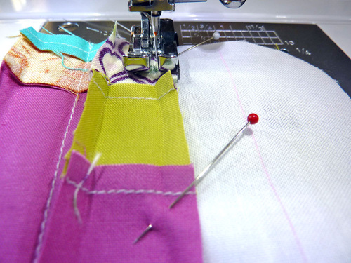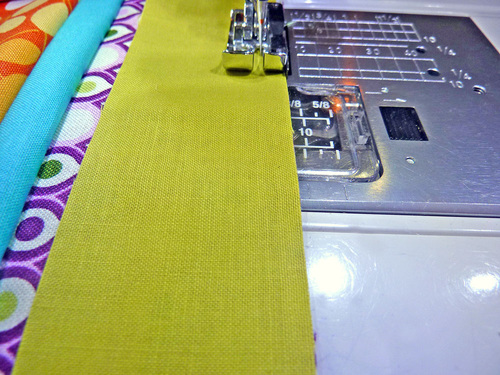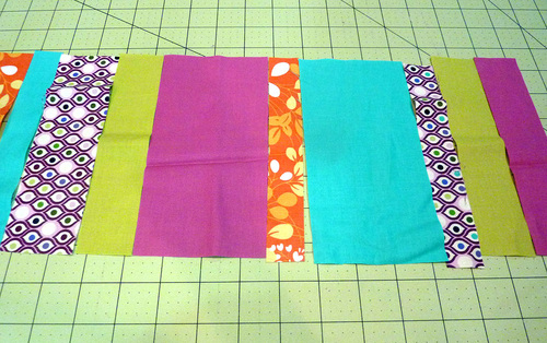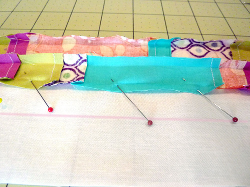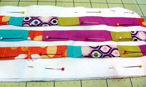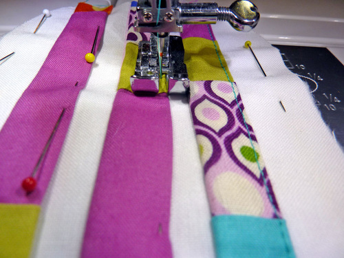 NOTE: Because the length of the strips is rather short, we simply pinned the strips together at the top corners. This was enough to hold them in place in the correct order. Once under the presser foot, it was easy to hold the strips together by hand to finish each short seam.