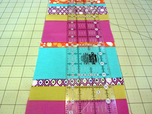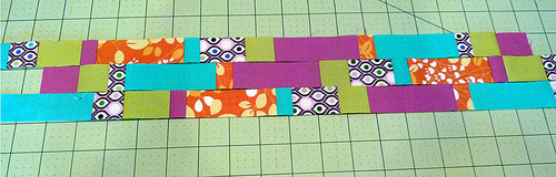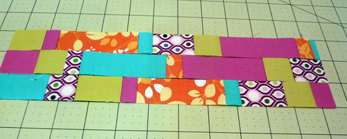 - Lay out your strips side by side, following our diagram above or your own color and pattern blend.
