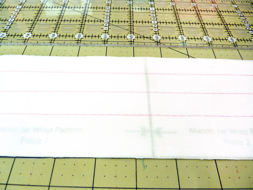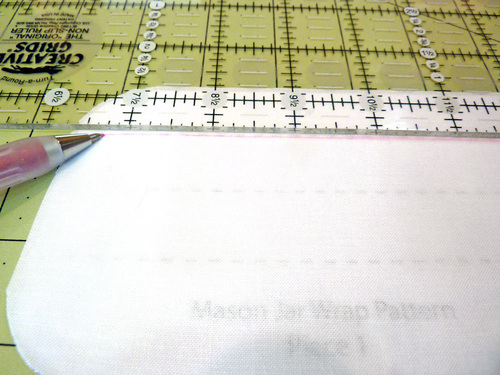 - Place the main fabric panel right side up on your work surface. Place the pattern piece underneath the front fabric panel. The pattern’s marked horizontal lines should be visible through the fabric. Using your ruler and fabric pen or pencil, trace each of the lines.