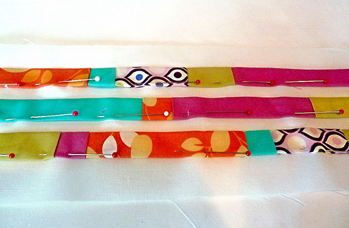 - Working in order, we chose from left to right, assemble the strips to build your fabric panel. To do this, start with the first two strips in the sequence. Place these strips right sides together and pin in place. Place the next strip in the sequence right sides together with the two-strip piece. Continue in this manner to pin together all the strips.