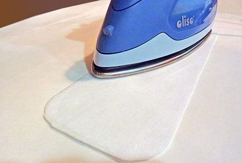 - Find the back panel (the knit in our sample) and the interfacing panel. Following manufacturer’s instructions, fuse the interfacing to the wrong side of the fabric. This provides stability and helps keep the knit from stretching too much.