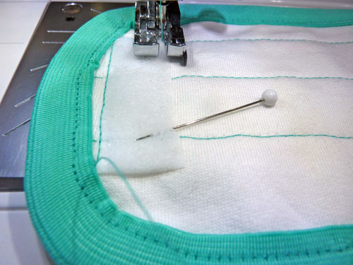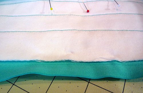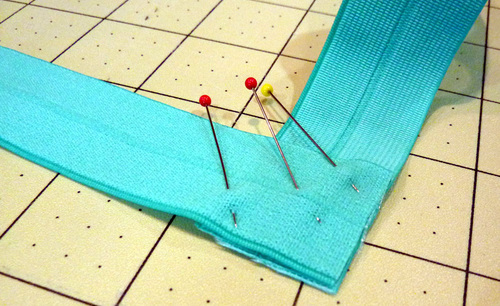 - Re-thread the machine with contrasting thread (we used aqua to match the fold-over elastic). Lengthen the stitch.