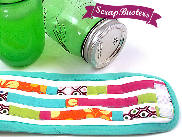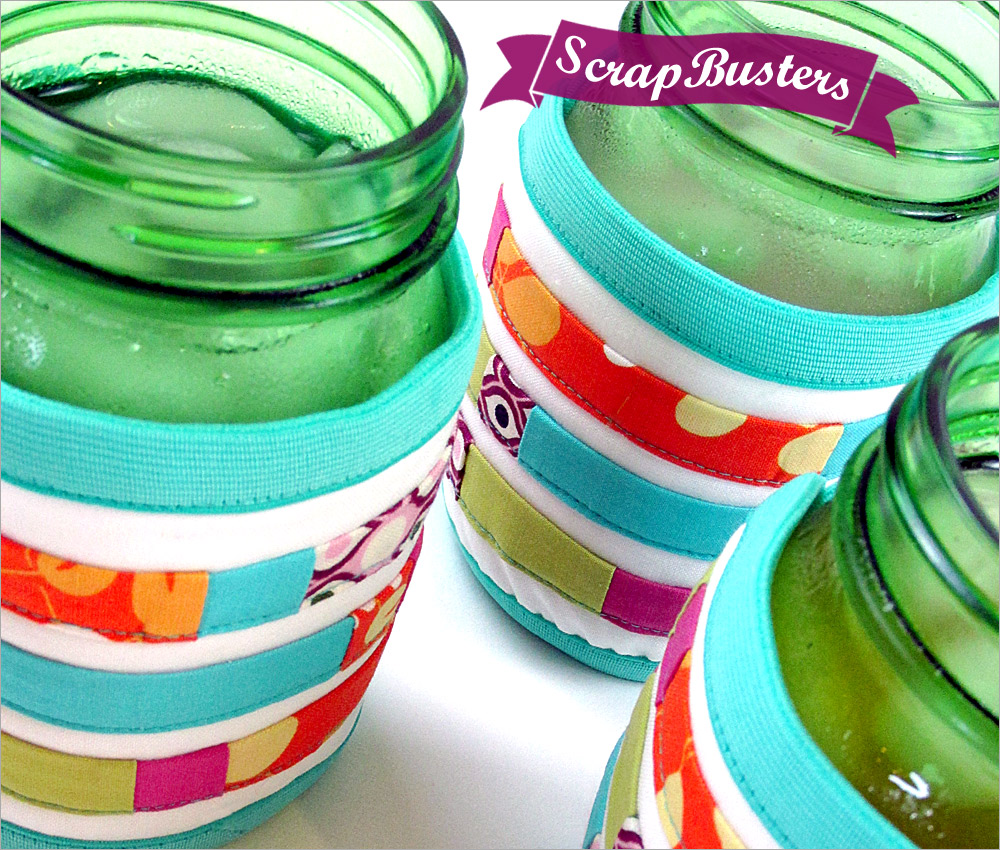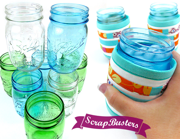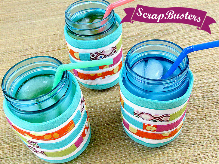 Grandma would be so proud. The humble Ball mason jar has become a very chic way to sip a cool summer drink. But as with all glassware, condensation beads up quickly on the outside of the jars, causing your grip to slip. A jar wrap helos absorb condensation, makes the jar easier to handle, and looks super cute. Our design features cotton on the exterior and knit on the interior. As a ScrapBusters project, we show you how to create pretty striped accent bands from a few fave pieces of leftover fabric.
