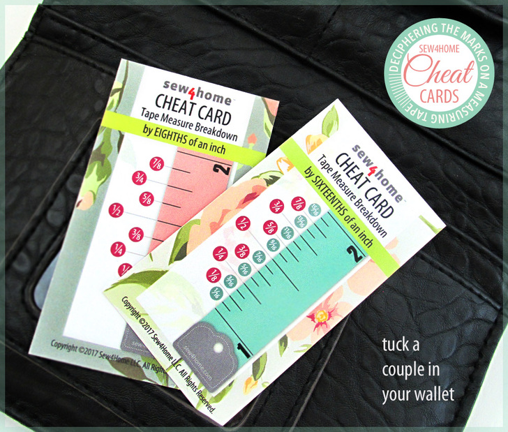 Our Measuring Tape Cheat Card is the size of a standard business card: 2” wide x 3½” high. It’s small enough to tuck into your wallet or tack up on the bulletin board in your sewing room.