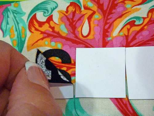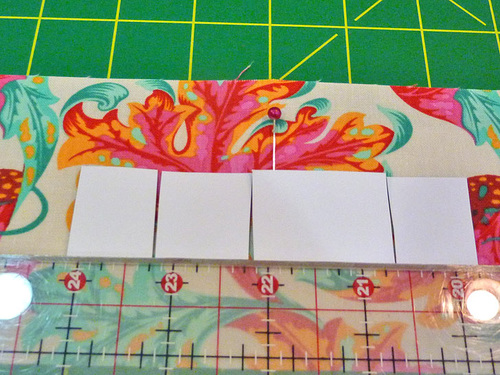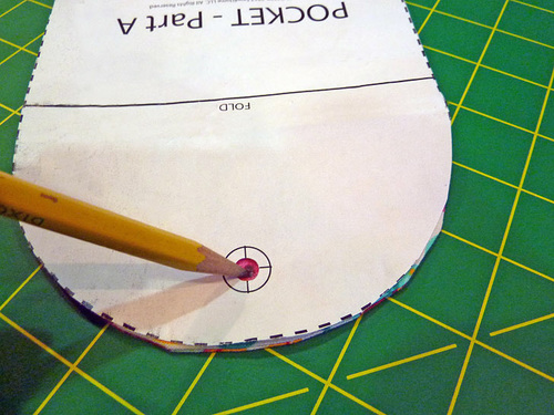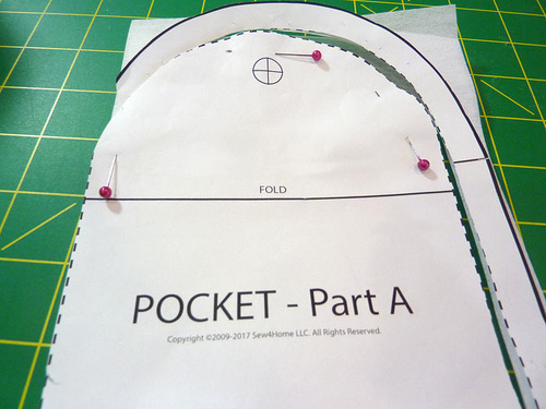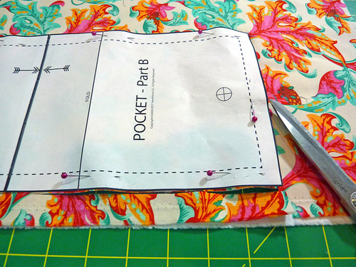 Using the assembled pocket pattern, cut TWO; we folded our fabric and fussy cut both panels at once.