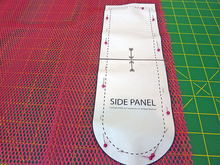 - Align the bottom curve of the side panel with the bottom fold, aligning the two center marks. You are placing the two pieces wrong sides together, however, the mesh fabric doesn’t really have a right and wrong side.