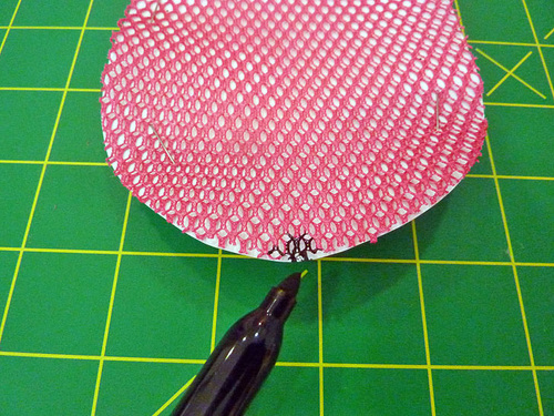 - Using a Sharpie® or similar (we found it easiest to see and mark the open weave of the mesh with the permanent marker – it will be covered with the binding), mark the center of the bottom curve of each side panel.