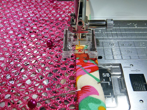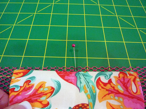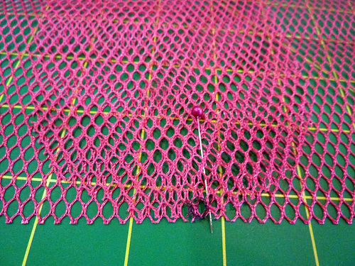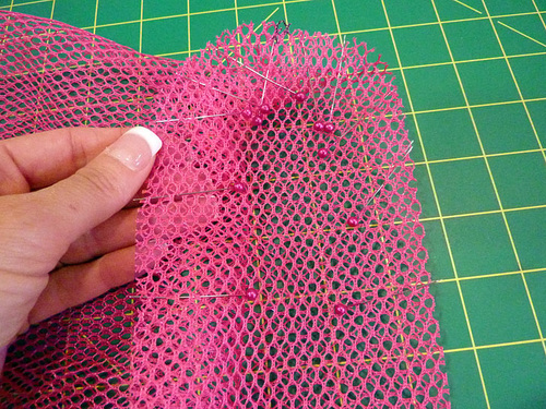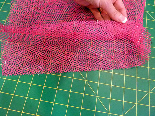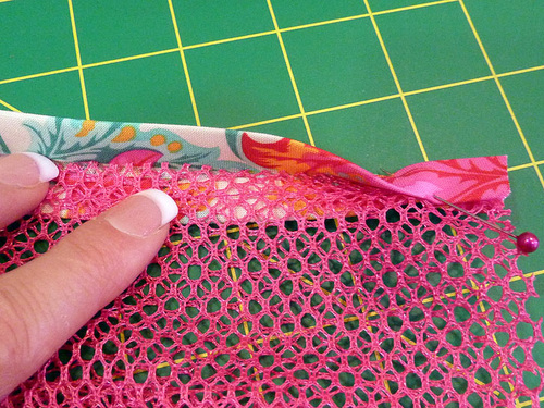 - The top folded edge of the pocket should be flush with the top raw mesh edge of the back panel. Pin in place.