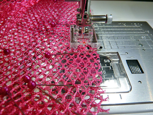 - The bottom folded edge of the facing should cover the lower seam allowance. Adjust the fold of the facing as needed so the bottom of the facing and the bottom of the accent band are flush front to back. You can see through the mesh so it’s important the two layers are even.