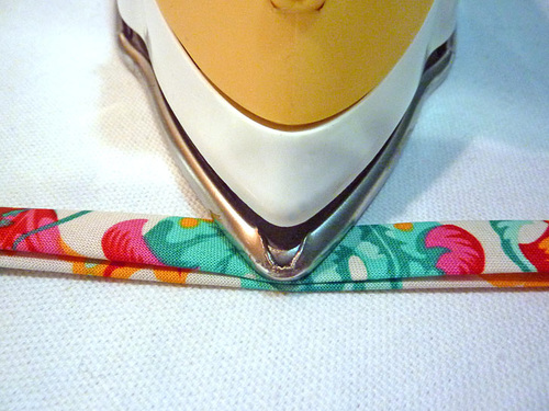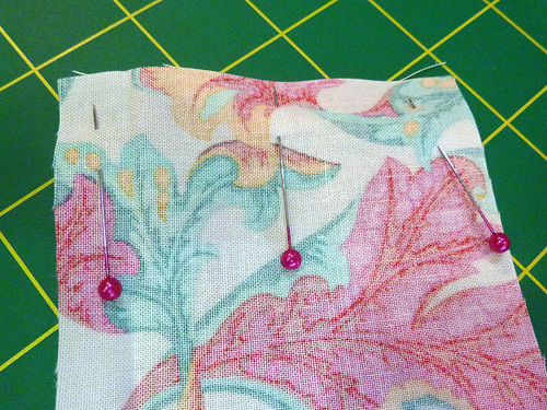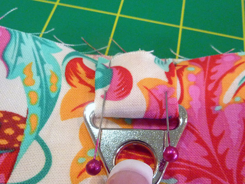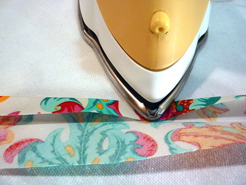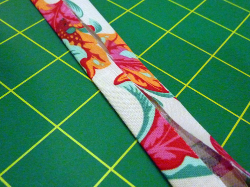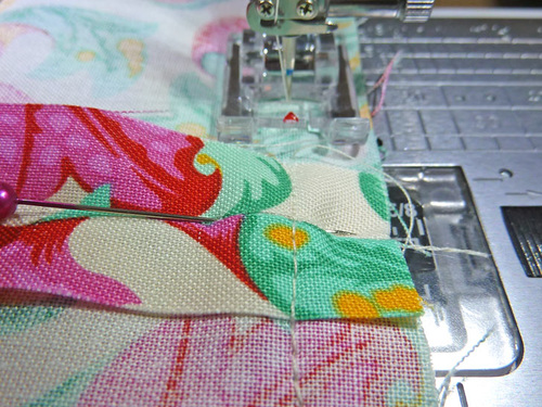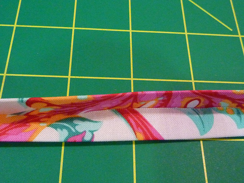 - Slip a binding strip over the seam allowance of each side panel. The raw edges of the seam allowance should sit right up against the center crease line of the binding. The slightly wider side goes towards the side panel, the narrower side towards the main panel. Start at the top edge with the binding flush, wrapping down and around, pinning as you go.