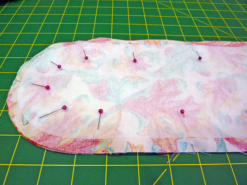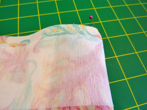 - You are setting a side panel into each side, a bit like a set-in sleeve. The raw edges of the two pieces should be flush and you’ll wrap the outer panel around the bottom curve of the side panel, easing as needed as you pin.
