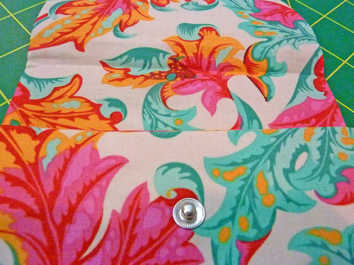 NOTE: If you are brand new to working with Dritz® Mini Anorak Snaps, the package itself has good directions. You can also check out our Credit Card Key Ring project that also uses these snaps and has additional photos you may find helpful. - Move the flap out of the way and edgestitch along both sides of the pocket from bottom to top. If possible, use a lock stitch at the beginning and end of your seam for the cleanest finish. If your machine does not have this feature, leave the thread tails long and hand knot at the back to secure.