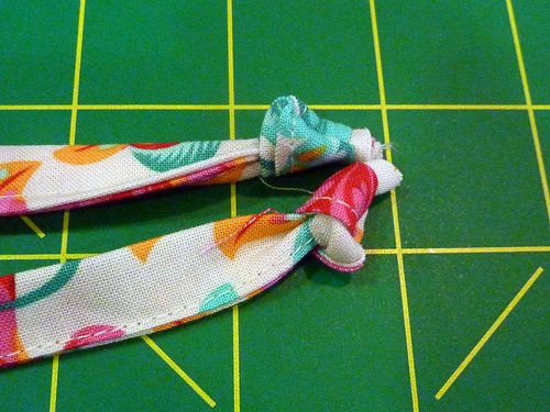 - Tie one end of each tie into a simple knot. You can add a drop of Dritz® Fray Check to the raw ends prior to knotting.