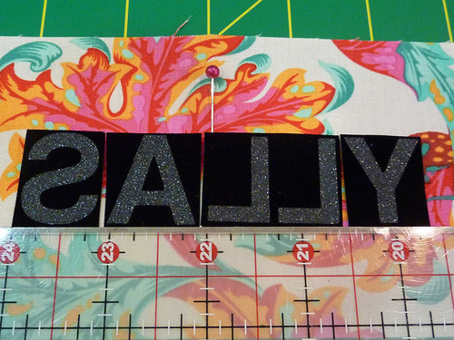 - Find the exact center point of the band measuring side to side. Place a pin at this point. Lay the edge of a see-through ruler 1¼” up from the bottom raw edge of the accent band. This will mark the bottom of your letters. You can use the ruler to draw in a guide line with a fabric pen or pencil, but we simply used the ruler itself as our guide. The slight thickness of the ruler was a good base for the thicker flocked Dritz® letters.