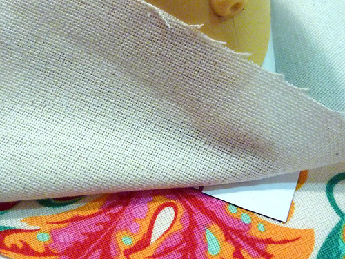 - Center the interfacing on the wrong side of one fabric panel so there is ½” of fabric showing beyond the interfacing on all sides. Following manufacturer’s instructions, fuse in place.
