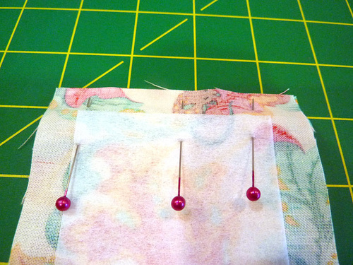 - Put the fused panel right sides together with the plain panel. The raw edges of the two pieces should be flush all around. Pin in place, leaving a 3” opening along one side for turning.
