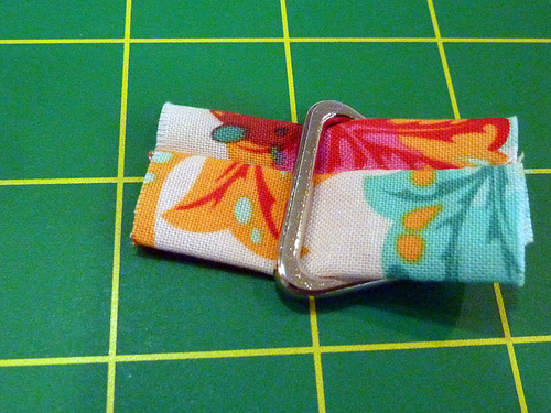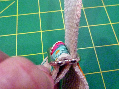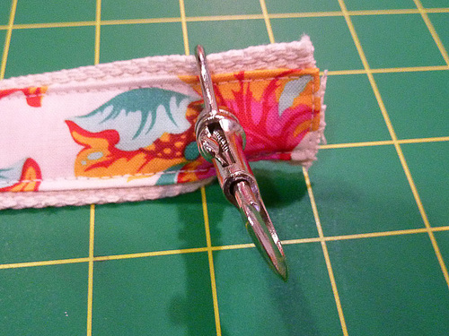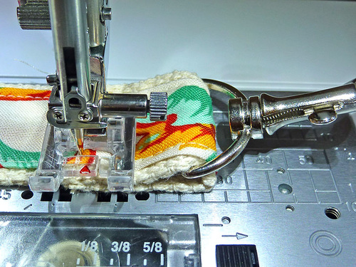 - Finally, slip the free end through the remaining Swivel Hook, pulling the end through about 1″. Edgestitch in place. Before stitching, do one more quick check to make sure there are no twists in your strap. Edgestitch in place.
