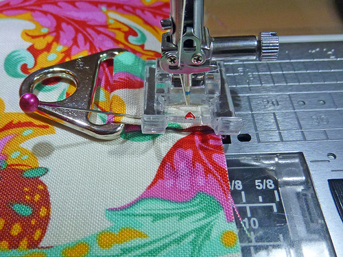 - Using a ½” seam allowance, stitch all around. Make sure your ties and loops are hanging straight down and flat – out of the way of the seam.