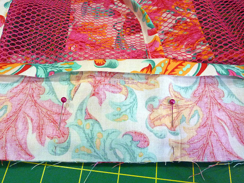 - Slip the accent loop over the top of the mesh bag. The loop and the mesh are right sides together. The BOTTOM raw edge of the accent band should be aligned with the top raw edge of the mesh, which means your word will be upside down. Pin in place all around.