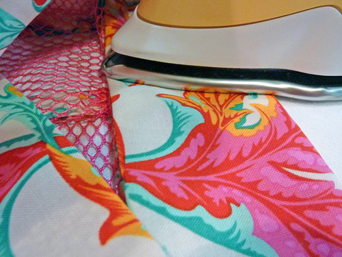 - Then fold the facing down into position inside the bag. This means the seam you just sewed is now running along the very top of the bag – along the top of the accent band. Press the facing into place. Again, remember to keep the hot iron away from the mesh or to use a pressing cloth.