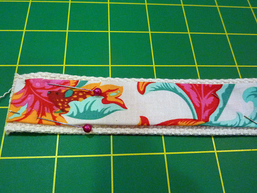 - Center the accent fabric right side up along the length of the belting and pin in place.