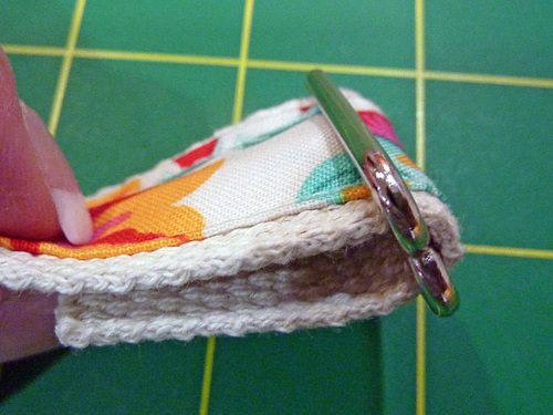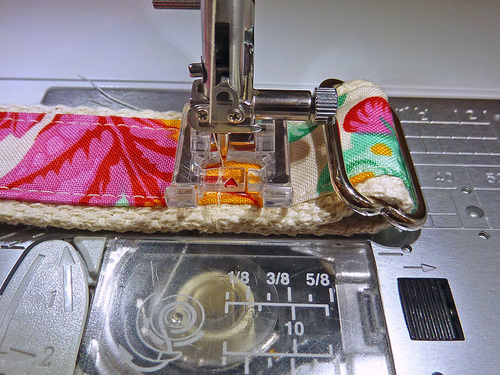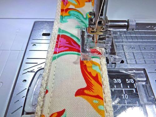 - Re-thread with thread to best match the fabric in the top and to best match the webbing in the bobbin. Slightly lengthen the stitch. Edgestitch along each long side.