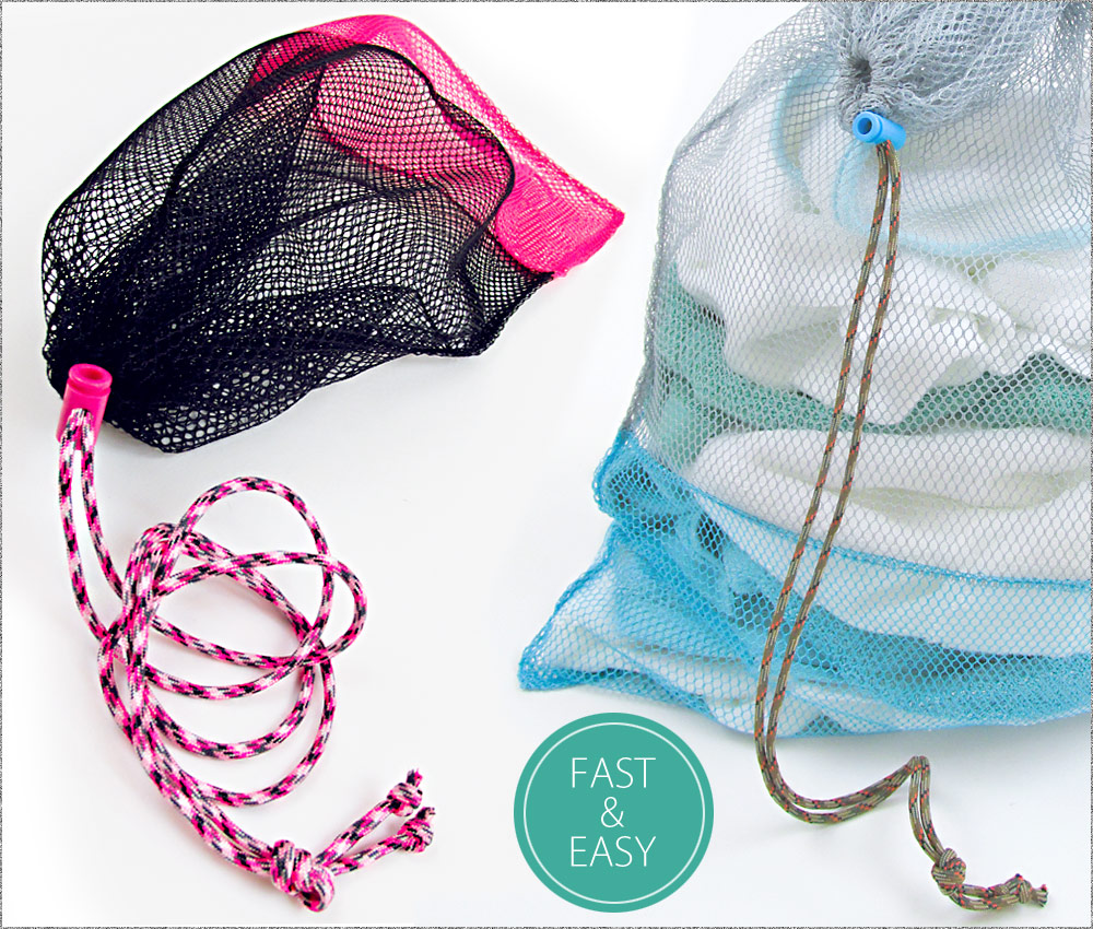 Mesh laundry bags to collect your washables are certainly readily available in stores and online, and they can be relatively inexpensive to purchase. However, they usually aren’t as well-made as you’d like, or maybe you need a special teeny-tiny size for baby socks, or want a fun color to tempt an otherwise messy teen to pick up his underwear. Time to bust out a few of your own. They’re super easy; we made our two samples in nothing flat.