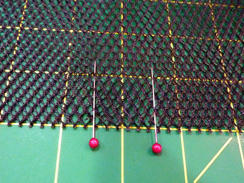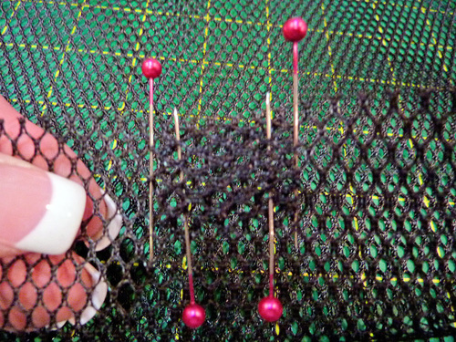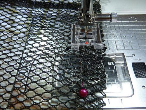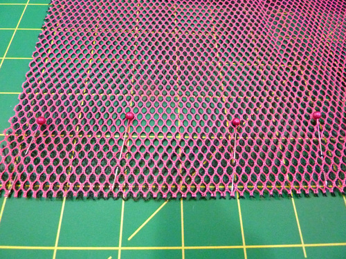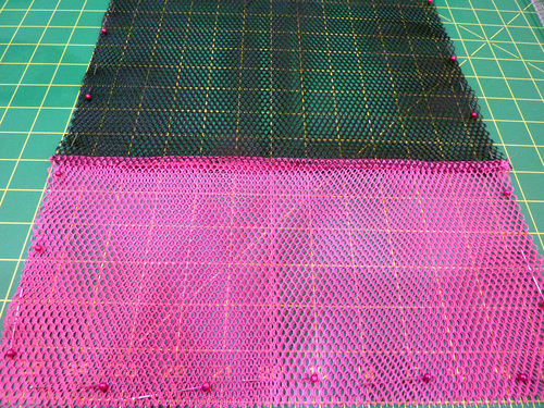 - Layer the two pieces of mesh on the inside of the bag, placing them between the pins. Line up all the mesh as best you can and pin in place.