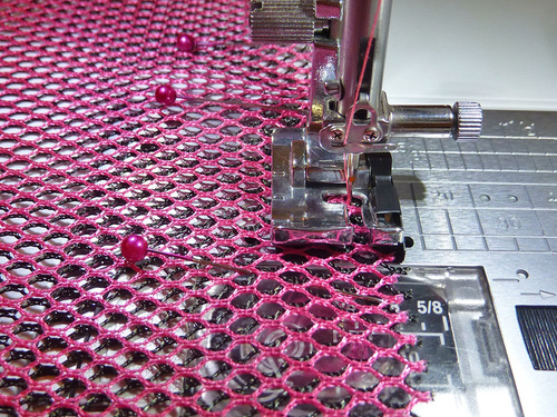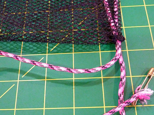 - Re-thread if necessary with thread to best match the top mesh. Edgestitch all the way around, securing the raw edge and creating a drawcord channel.