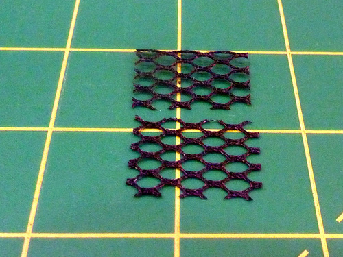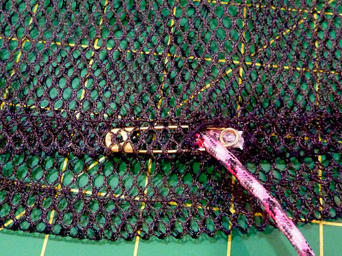 - Find the two small pieces of matching mesh you cut to reinforce the buttonhole area.