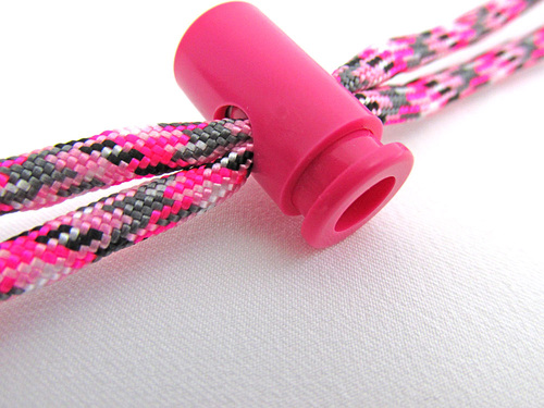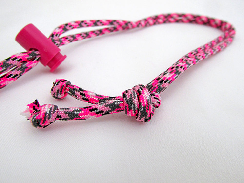 - ONE cord lock toggle; we used a standard single hole cord lock/toggle slider in bright pink – look for the variety made to fit paracord