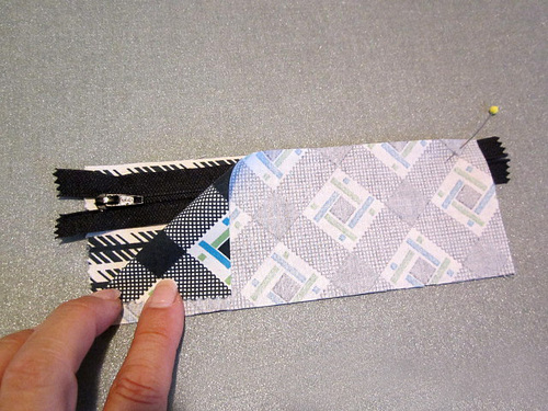 - Place the zipper, right side up, across the top edge of the fabric. The raw edge of the fabric and the edge of the zipper’s insertion tape should be flush.