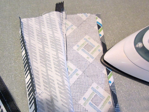 - When both edges are bound, flatten the pouch so the zipper is at the exact top, the bottom is a clean folded edge, and the binding overlap is positioned at the bottom/back of the pouch. The edges of the FOE should be flush with one another. When aligned, you’ll be looking at the center woven lines side by side, so the edge will appear as a solid color… cool!