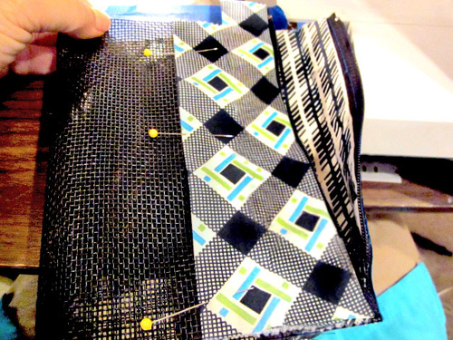 - Insert one 8″ edge of the pet screen in between the two front fabric layers. Push the screen all the way up against the zipper seam. Fold the fabric layers down into place on either side of the screen, and pin to secure.