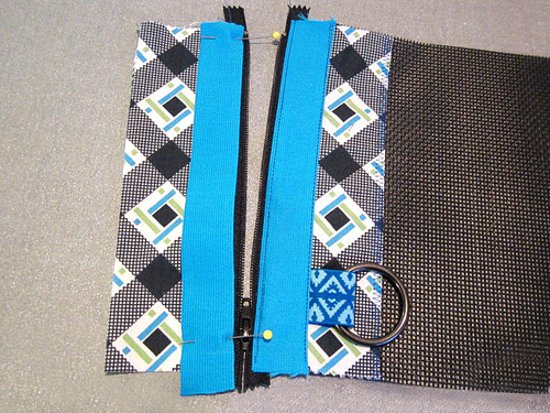 - Place the exterior accent band right side down over the top of the zipper, aligning the top raw edge of this fabric layer with the top edges of the other layers, sandwiching the zipper between the two pieces of fabric.