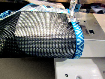 - Repeat to attach the elastic and insert the Pet Screen on the back of the pouch, except there is no ring on the back. You simply fold-up the remaining 8″ raw edge of the Pet Screen. The bottom of the pouch is this middle fold of the screen.