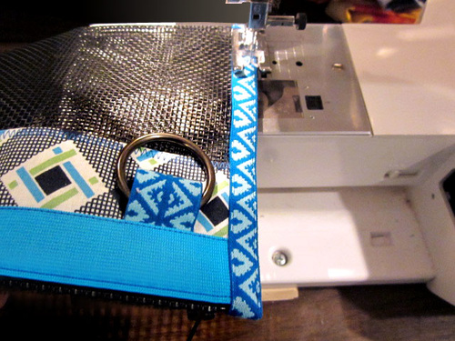 - Slip the the pouch back under the presser foot, and edgestitch through ALL the layers along both outer edges of the elastic. You are stitching through a lot of layers here, but fold-over elastic is usually nice and soft, which makes needle penetration easier. Go slowly, and if you need to stop to adjust, make sure the needle is in the down position.