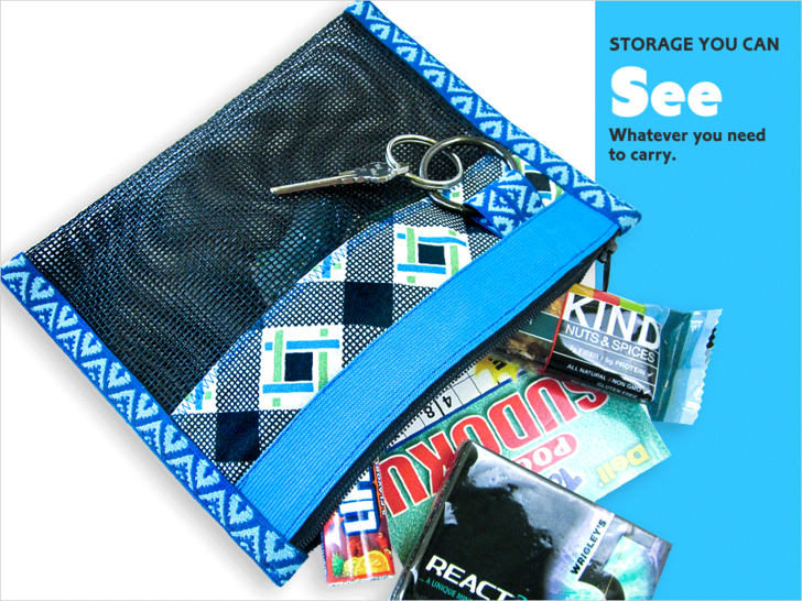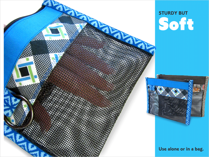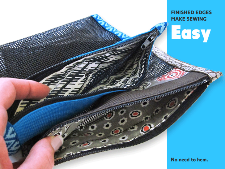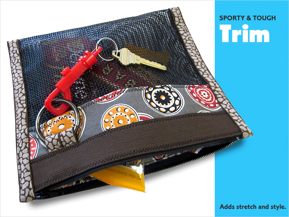 The open mesh of the pet screen allows you to easily see what’s inside. It’s also great when you need to sift out sand after a day at the beach or shake out crumbs from on-the-go snacks. The elastic is used like a binding, adding heft and flexibility rather than stretch. And the fabric accent panels are perfect for pre-cuts or scraps. What do you need to carry today?