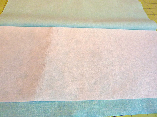 - Unfold it, wrong side up, so you can see the crease. Place the 14″ x 6″ piece of interfacing on the bottom half, aligning the top of the interfacing with the crease line. There will be 1″ of fabric showing below the bottom of the interfacing. Following manufacturer’s instructions, fuse in place.