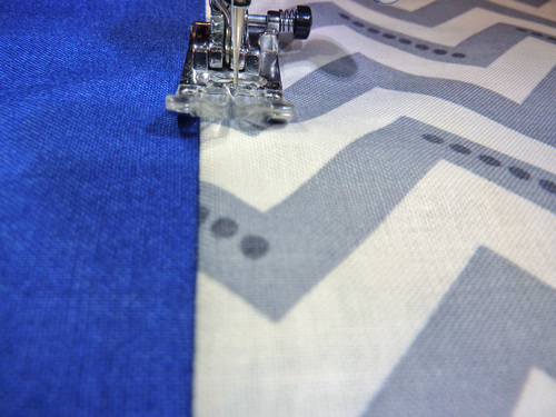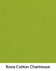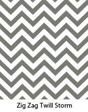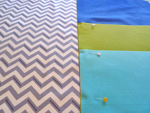 We originally used the Simply Color collection by Vanessa Christenson for Moda, an older collection that is no longer readily available, but you can achieve a very similar look by choosing a chevron pattern and three solid colors to match your décor. For a very close match, we found lightweight Premier Prints Zig Zag Twill in Storm along with three similar colors of Kona Cotton: Royal Blue, Chartreuse, and Pool – all at Fabric.com. Swatches are shown below.