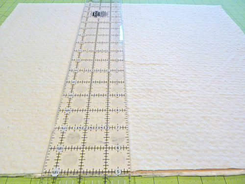 - Using your clear ruler and a fabric marking pen, draw a light-colored line down the center of the batting. You will use this as a guide line to center the front panel.